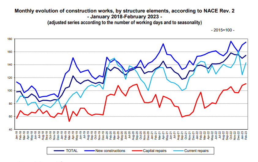 The volume of construction works increased in February 2023 compared to February 2022, as a gross series, by 10.5%. On structural elements, new construction works (+14.2%) and major repairs (+12.9%) increased. Current maintenance and repairs decreased by 0.9%.