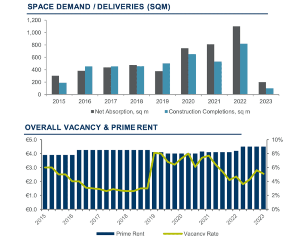 The demand for industrial and logistics spaces remains relatively strong at the beginning of the year, even in a context characterized by high inflation and interest rates, decelerating consumer demand and economic overall uncertainty. The total take-up for Q1 2023 was of around 331,100 sq. m, up from 305,000 sq. m registered in the same period of last year. The overall leasing activity was mainly driven by the new demand, accounting for a robust share of 60% (198,000 sq. m) in the Q1 2023 gross take-up. Moreover, the pre-lease contracts signed in Q1 2023 amounted to over 50% of the new demand, mainly related to projects due to be delivered in 2024.