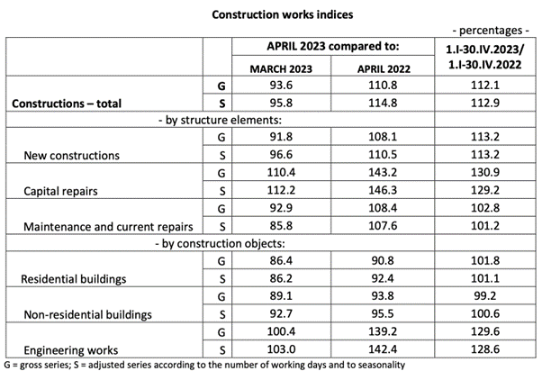 In April 2023, the volume of construction works decreased, as gross series, by 6.4% compared to March 2023 and was down 4.2% as adjusted series according to the number of working days and to seasonality. In April 2023, the volume of construction works rose, as gross series, by 10.8% compared to April 2022 and was up 14.8% as adjusted series according to the number of working days and to seasonality. In the 1.I-30.IV.2023 period, the volume of construction works increased, as gross series, by 12.1% compared to the 1.I-30.IV.2022 period and was up 12.9% as adjusted series according to the number of working days and to seasonality.