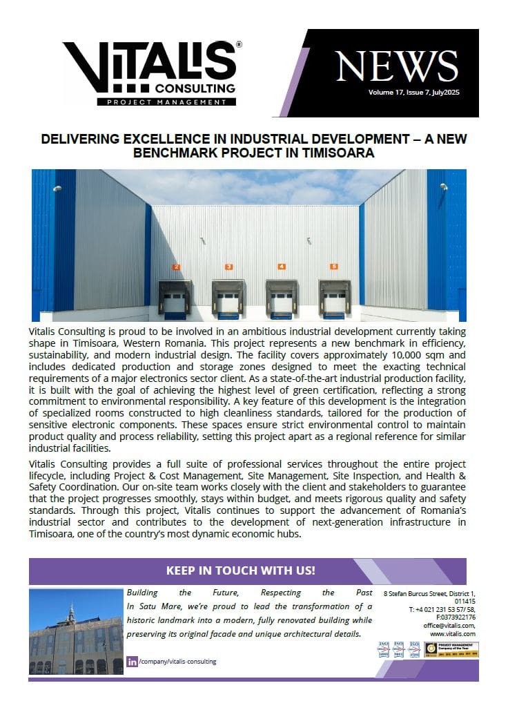 Vitalis Consulting provides a full suite of professional services throughout the entire project lifecycle, including Project & Cost Management, Site Management, Site Inspection, and Health & Safety Coordination. Our on-site team works closely with the client and stakeholders to guarantee that the project progresses smoothly, stays within budget, and meets rigorous quality and safety standards. Through this project, Vitalis continues to support the advancement of Romania’s industrial sector and contributes to the development of next-generation infrastructure in Timisoara, one of the country’s most dynamic economic hubs.